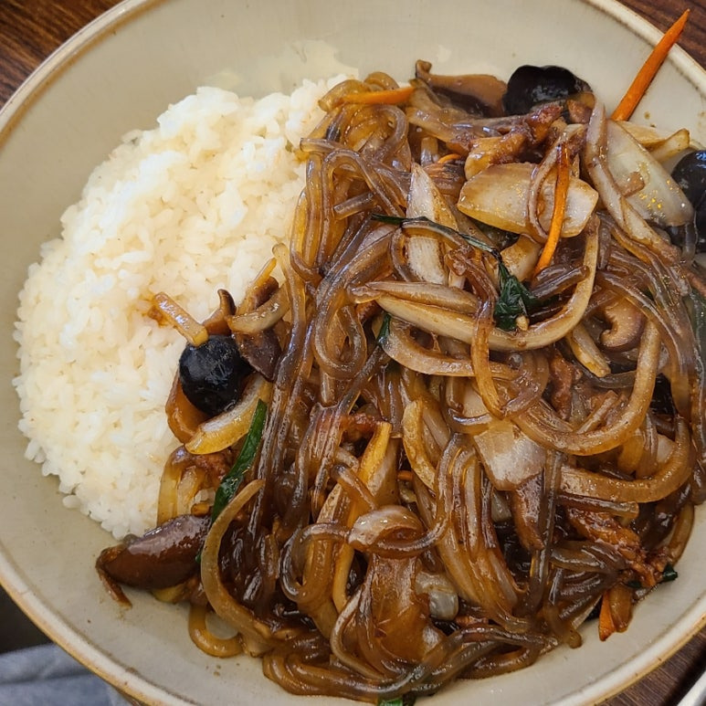 그래서 이건 반찬의 변형이 아니라, 덮밥이라는 문법으로 새롭게 쓴 잡채의 문장이에요.